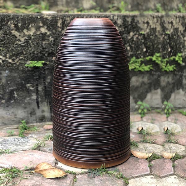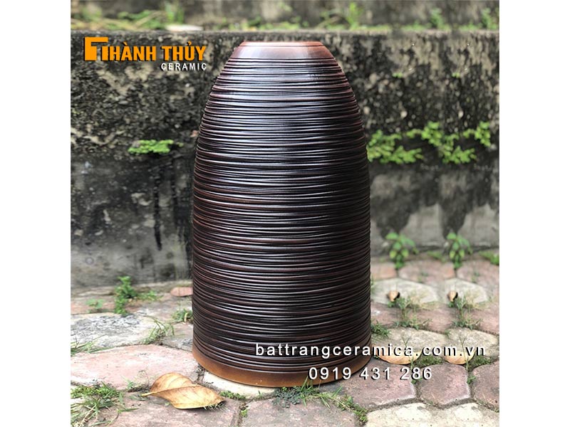 Bình chuông cắm đào huyền cao 52cm được làm thủ công hoàn toàn thủ công, miệng nhỏ chân phình to vững chãi. Chất men mộc mạc, tông màu nâu sần sùi như những gốc đào cổ thụ. Bình chuông được nung ở 1300 độ C, đảm bảo độ bền và vững khi cắm những cành đào siêu to khổng lồ.