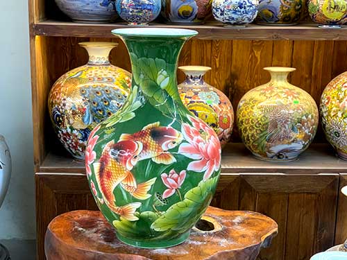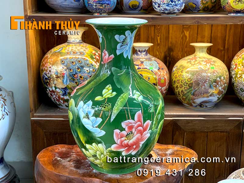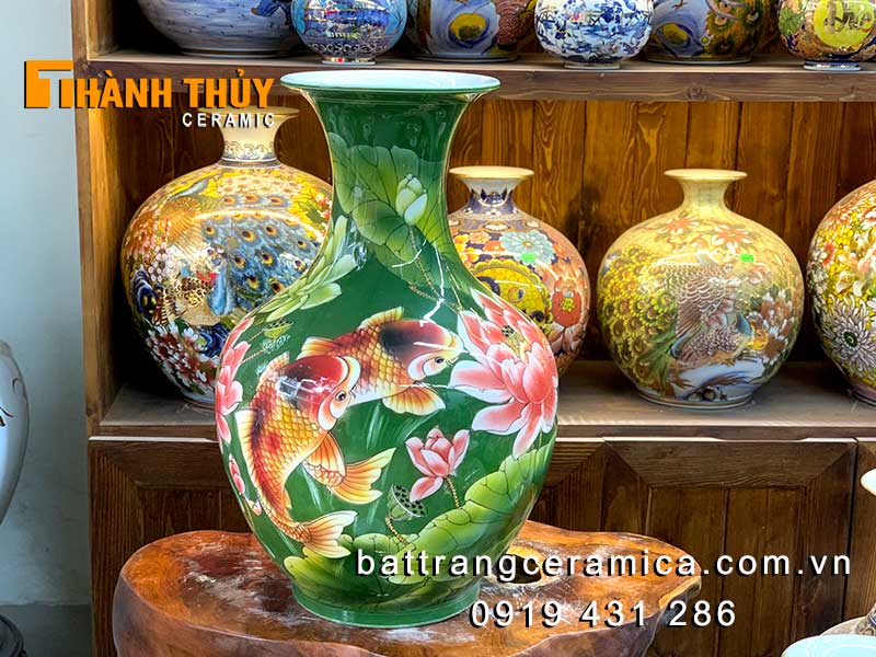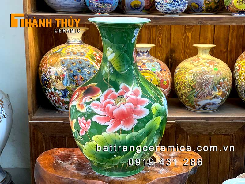 Bình củ tỏi màu xanh lá cây vẽ sen cá 60cm gốm sứ cao cấp Bát Tràng. Chiếc lục bình củ tỏi bát tràng này được dùng để trưng bày ở không gian phòng khách, phòng thờ để mang lại tài lộc và phú quý cho gia chủ.