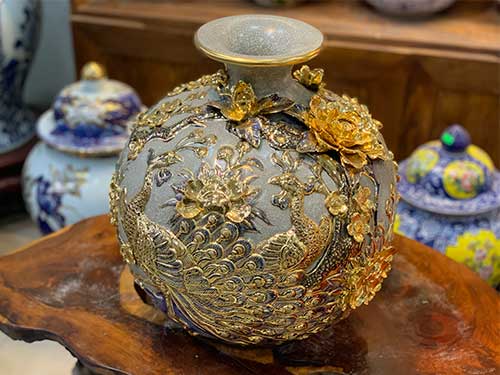 Bình hút lộc Công Đào đắp nổi vẽ vàng 24k