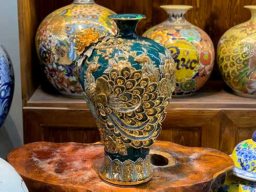 Phía sau bình tích lộc đắp nổi chim công hoa đào cao cấp