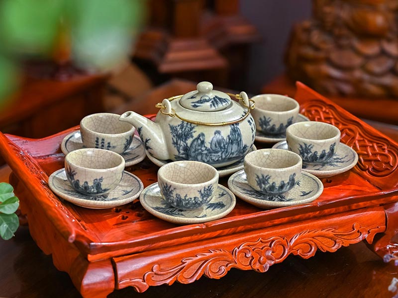 Bộ ấm chén men rạn cổ Trúc lâm thất hiền loại cao cấp Bát Tràng. Bộ ấm chén giả cổ này được thể hiện bằng những nét vẽ tinh túy của người Việt xưa thể hiện nét văn hóa uống trà và thưởng thức trà của cha ông chúng ta.