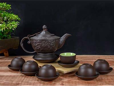Bộ ấm trà hoàng gia gốm Bát Tràng được làm từ chất liệu gốm đen một loại đất được tinh luyện riêng để làm nên những bộ ấm chén vô cùng đẹp mắt.