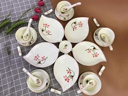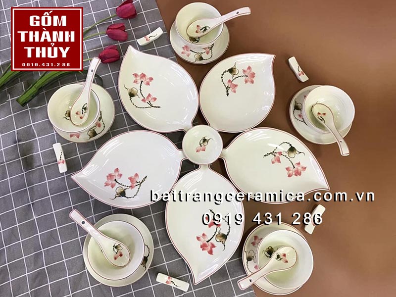 Bộ bát đĩa bày cỗ vẽ hoa sen men kem gốm sứ cao cấp Bát Tràng.