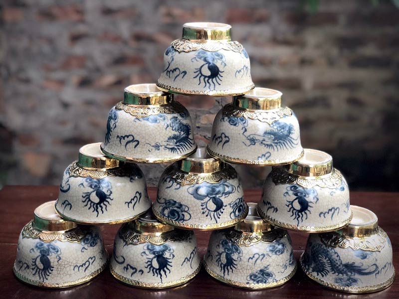 Bộ bát đĩa cúng gia tiên bọc đồng hàng men rạn giả cổ của Bát Tràng. Bộ bát thắp hương này được đắp nổi với sự tâm huyết, tỉ mỉ của người thợ gốm. Các chi tiết đều là vẽ tay thủ công hoàn toàn, miệng và chân bát còn được bộc đồng nhìn sang trọng và tinh sảo.