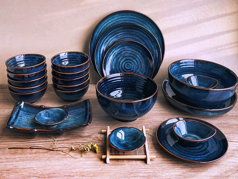 Bộ bát đĩa bát tràng giá rẻ men hỏa biến xanh đại dương