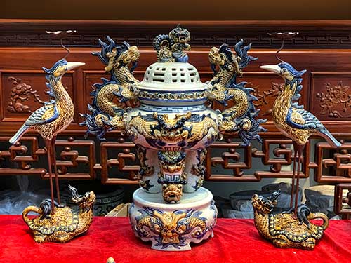 Bộ đỉnh hạc sứ men rạn cổ cao cấp 60cm được nung ở trên nhiệt độ 1200 độ C nên nó có độ bền rất cao. Bên ngoài đỉnh được tráng 1 lớp men rạn cổ đặc trưng của đồ thờ cúng Bát Tràng, các hoa văn họa tiết được làm hoàn toàn thủ công chính từ đôi tay nghệ nhân nổi tiếng của làng nghề Bát Tràng.