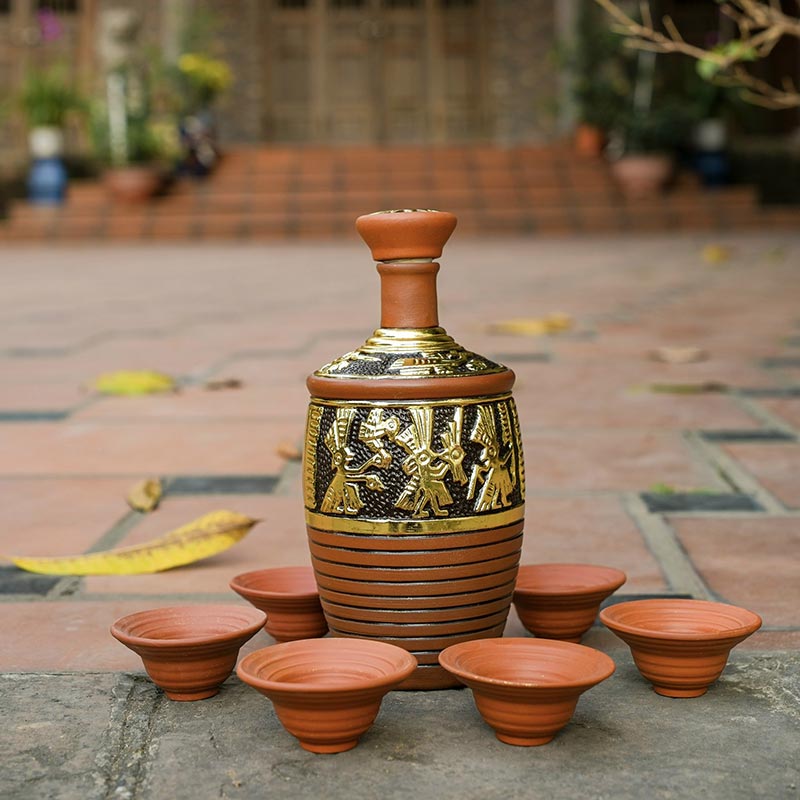 Bộ nậm đựng rượu gốm dát vàng 1 lít bao gồm 1 nậm đựng rượu dung tích 1 lít và 6 bát uống rượu.