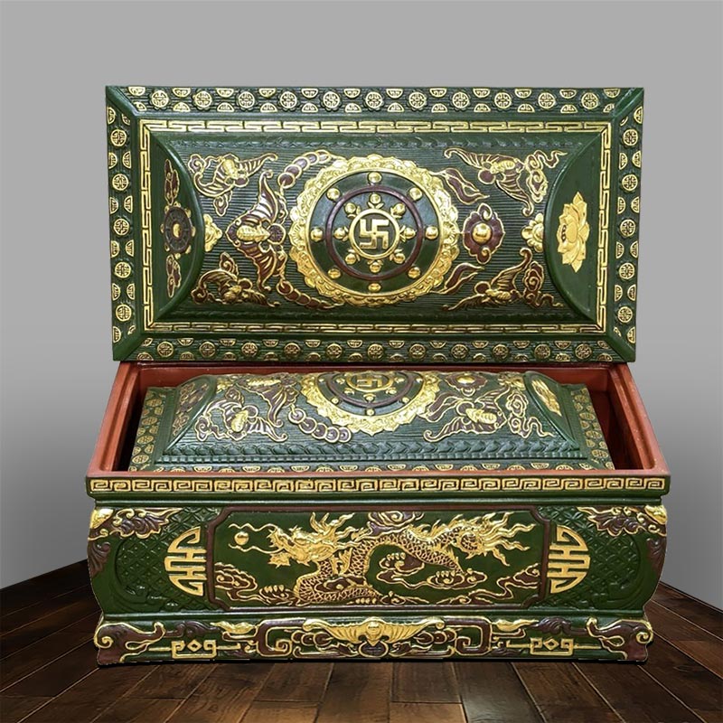 Bộ tiểu quách rồng ngũ phúc màu xanh lục bảo hàng cao cấp của Bát Tràng. Khác hẳn với các sản phẩm truyền thống ngày xưa, Tiểu quách gốm Bát Tràng giờ đây được làm cẩn thận, sắc nét và vô tinh tế để đáp ứng nhu cầu của tất cả khách hàng vừa phải bền, đẹp và hợp với mệnh của người đã mất.