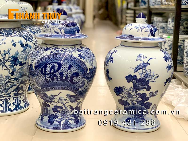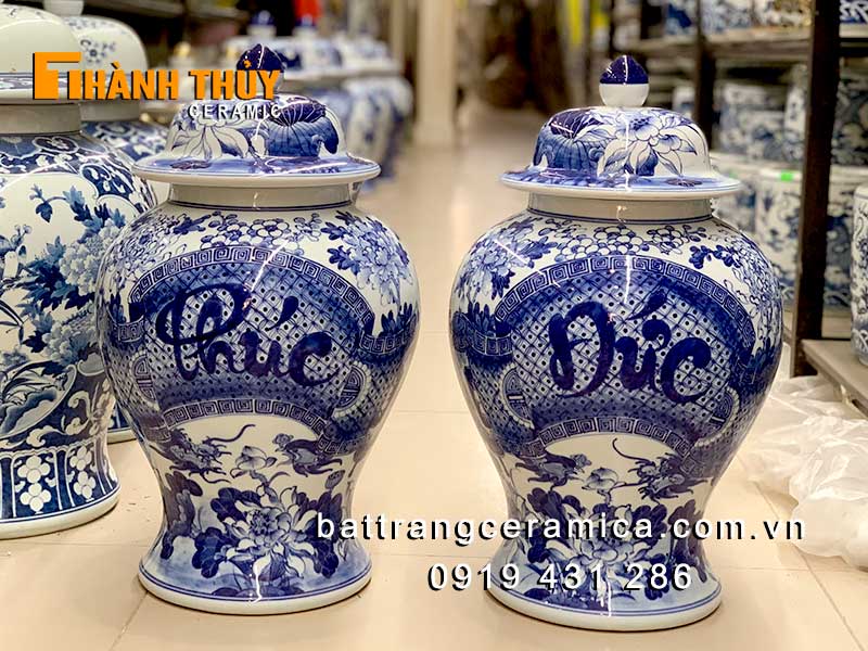 Chóe thờ phong thủy phúc đức men lam 15 lít gốm sứ Bát Tràng.