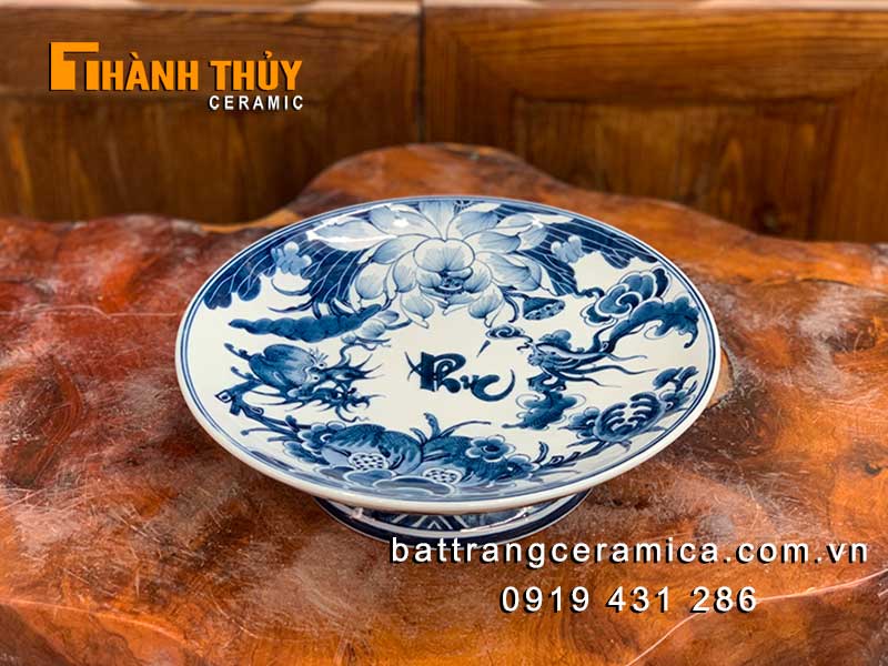 Mâm bồng sứ bát tràng chân liền vẽ sen cao cấp