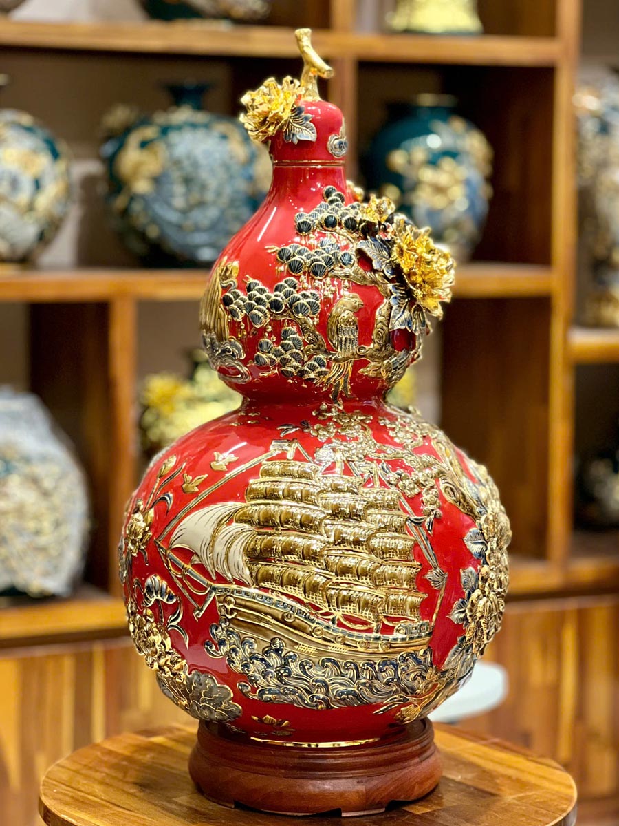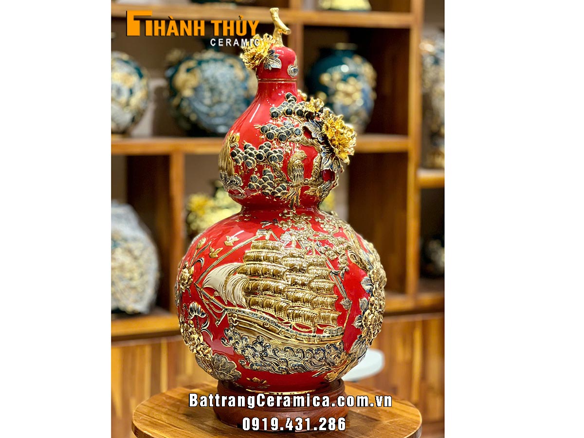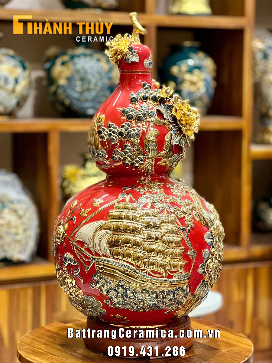Hồ lô cao cấp Thuận buồm xuôi gió cao 65cm là một vật phẩm phong thuỷ có hoạ tiết Thuyền buồm đang lướt trên mặt nước với ý nghĩa mang lại may mắn, tài lộc và sự thành công cho gia chủ. Bình hồ lô này thường được đắp nổi kênh bông vô cùng tinh sảo. Hoạ tiết được vẽ vàng 24k và nung thêm 1 lần nữa để tăng thêm vẻ đẹp sang trọng và giá trị cho sản phẩm.
