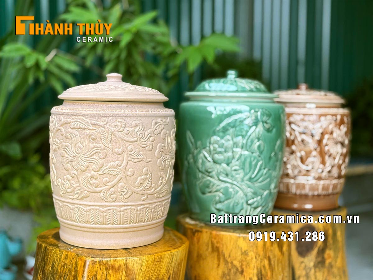 Hoa văn hoa dây được chạm khắc tinh xảo, nổi lên rõ nét và mềm mại trên thân hũ. Những đường nét uyển chuyển ấy như kể lại câu chuyện của bàn tay nghệ nhân – tỉ mỉ, kiên nhẫn và đầy yêu nghề. Nhờ lớp men phủ kỹ lưỡng, từng chi tiết đều được làm nổi bật, tạo nên hiệu ứng ánh sáng đẹp mắt khi quan sát gần.