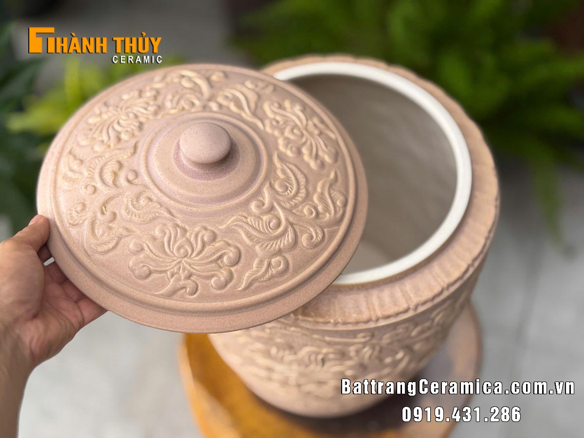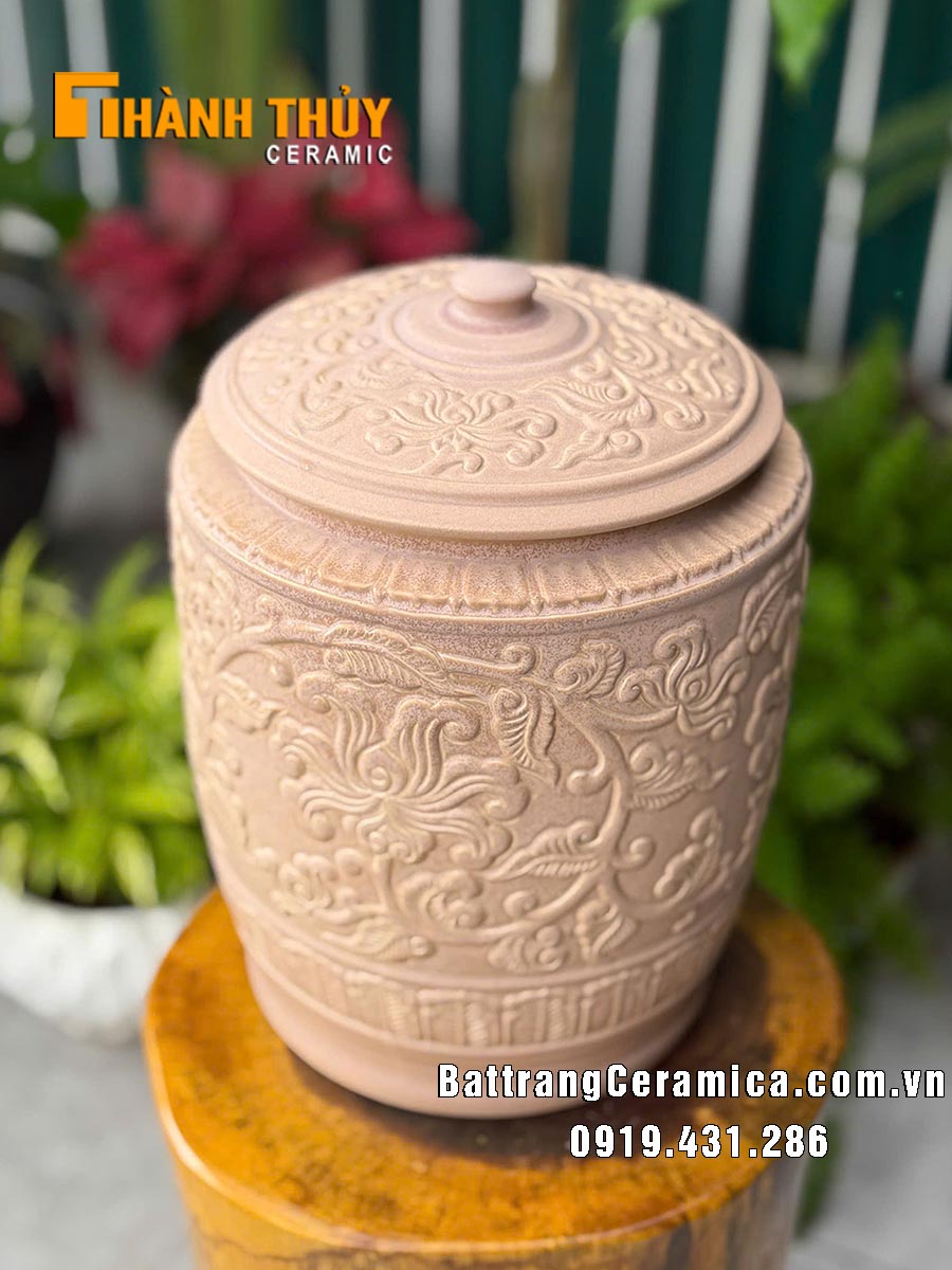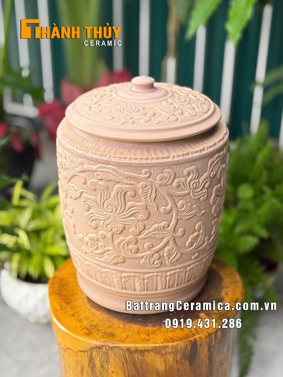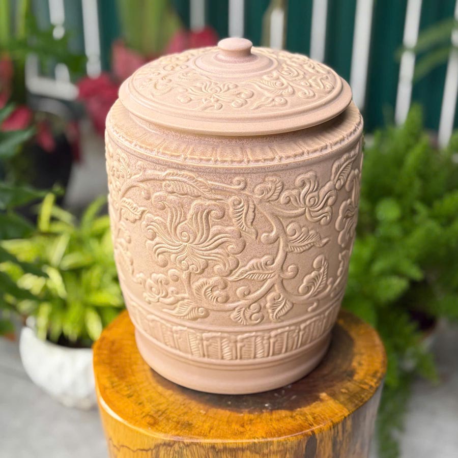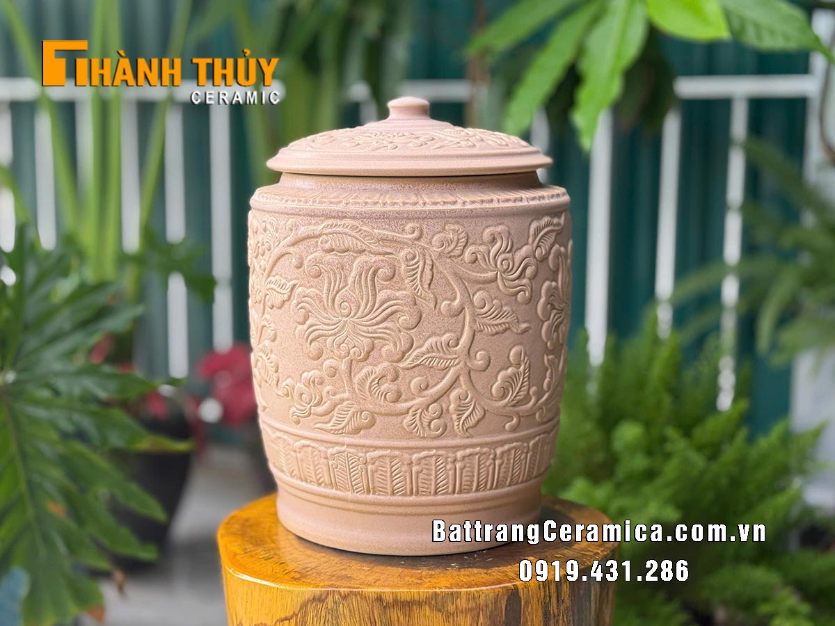 Không chỉ đẹp, chiếc hũ còn mang ý nghĩa phong thủy tốt lành. Sắc nâu tượng trưng cho hành Thổ – sự bền vững, ổn định và sung túc. Hũ gạo từ lâu đã là biểu tượng của sự đủ đầy trong gia đình, và khi kết hợp với hoa văn mềm mại, sản phẩm càng trở thành vật phẩm gìn giữ lộc phúc, tạo cảm giác an yên cho không gian sống.