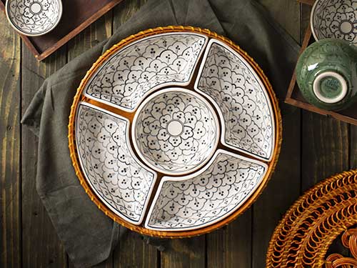 Khay đựng bánh kẹo này bao gồm 1 khay mây tre đan và 5 đĩa sứ bên trong. Kích thước đường kính khay là 30 cm.