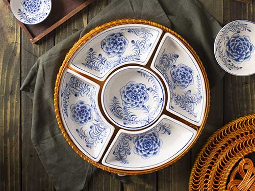 Khay đựng bánh kẹo này bao gồm 1 khay mây tre đan và 5 đĩa sứ bên trong. Kích thước đường kính khay là 30 cm.