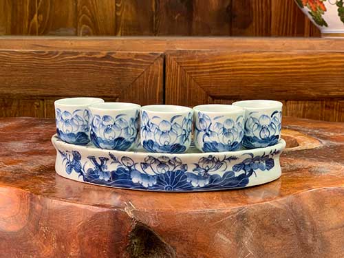Kỷ 5 chén trên bàn thờ vẽ hoa sen là 1 món trong bộ đồ thờ cao cấp của bát tràng. Hoạ tiết vẽ tay thủ công, bằng dòng men lam phục chế lại dòng men của các đồ gốm sứ cổ cung đình Huế.