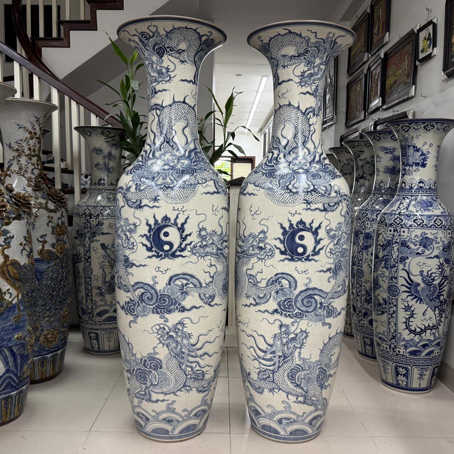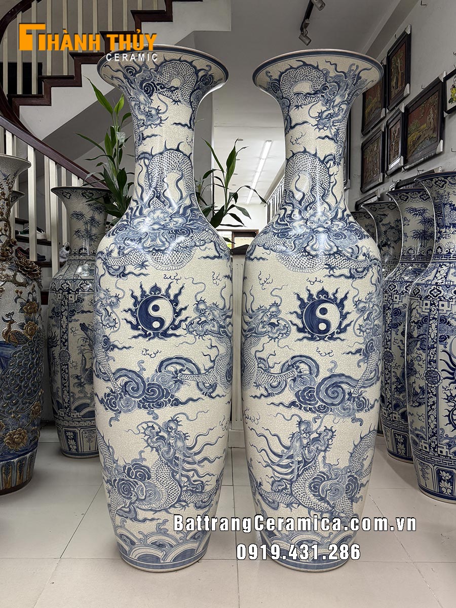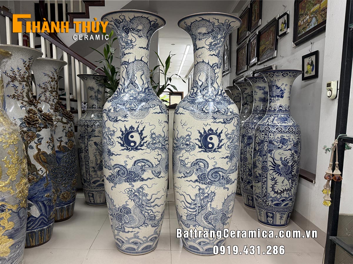 Lọ lục bình sứ vẽ Rồng men rạn cao 1m6 là đôi lộc bình phong thủy mang ý nghĩa tượng trưng cho sự sung túc về tiền bạc, phát tài phát lộc, sự sinh sôi nảy nở, sự phát triển những điều mới mẻ, may mắn…