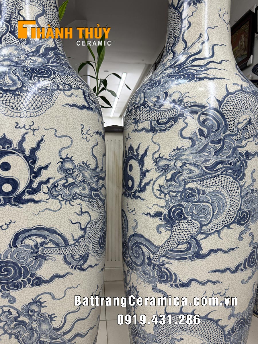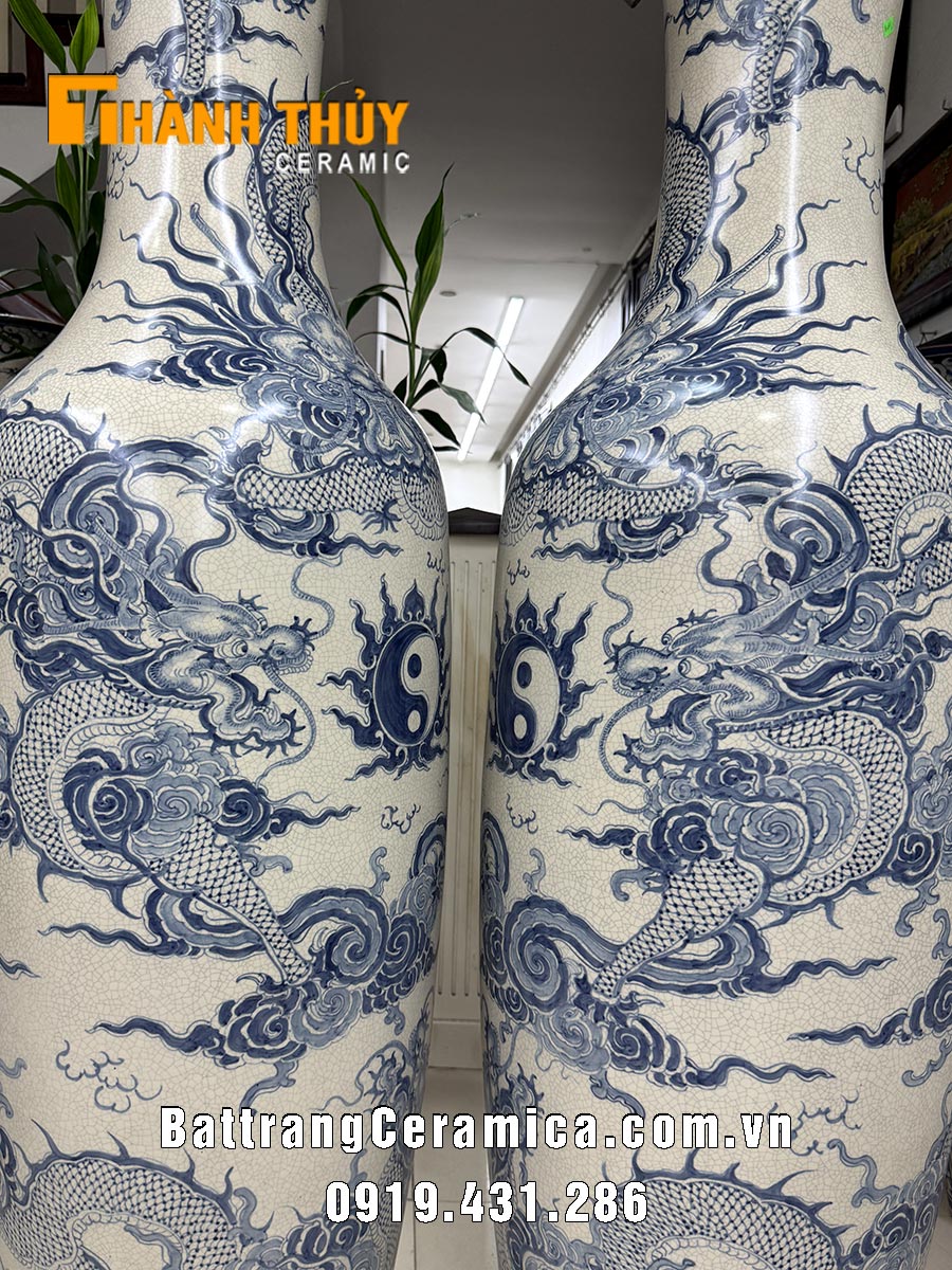Lọ lục bình sứ vẽ Rồng men rạn cao 1m6. Trên thân đôi lục bình sứ vẽ 5 con Rồng hay còn gọi là Ngũ long chầu nguyệt vừa có tác dụng hóa giải tam sát trong phong thủy vừa đem lại sự hưng thịnh, quyền uy cho gia chủ.