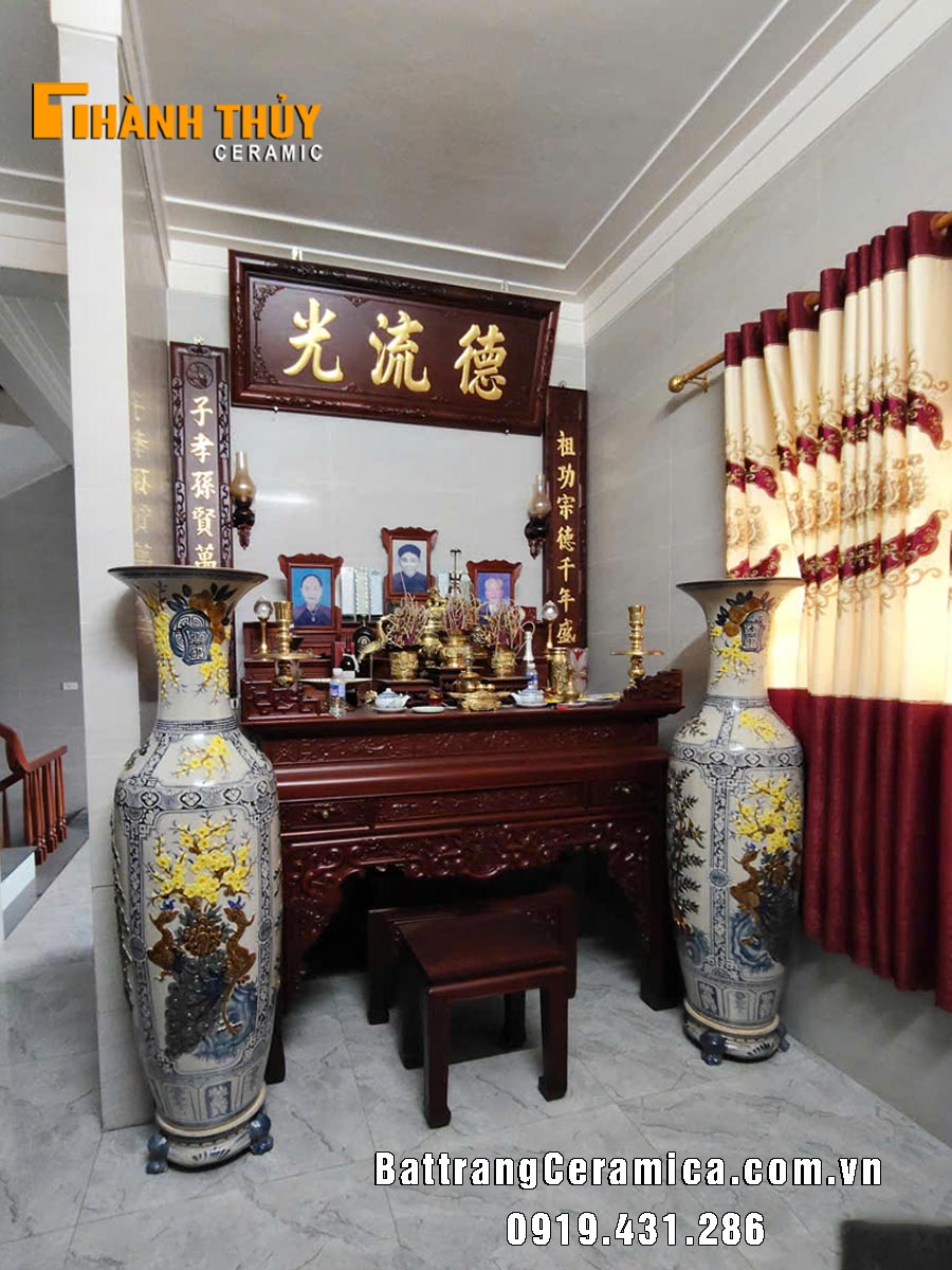 Lộc bình đắp nổi tứ cảnh bày hai bên bàn thờ