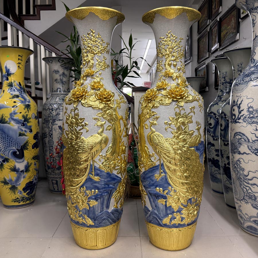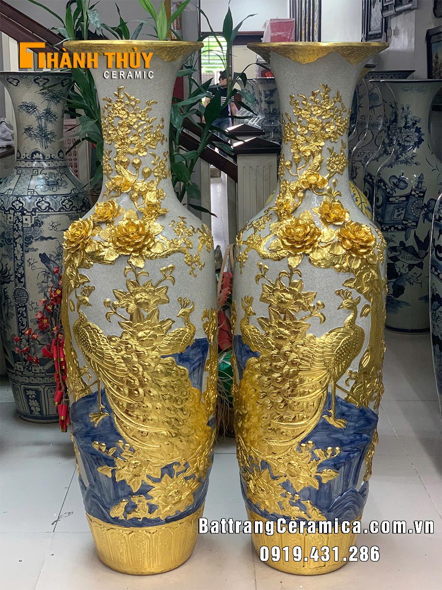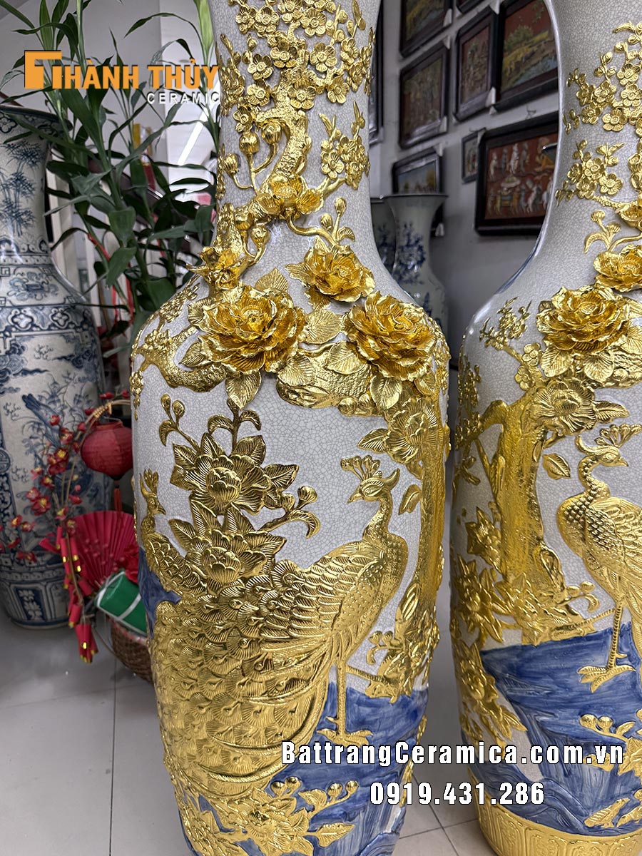 Lộc bình dát vàng cao cấp Công Đào 1m4 là dòng lộc bình đắp nổi của Bát Tràng. Đôi lọ lục bình sứ này được đắp nổi thủ công vô cùng tinh sảo, bố cục đẹp nhấn nháy như 1 tác phẩm điêu khắc hoàn chỉnh. Đặc biệt những chi tiết chính trên thân bình được dát vàng, tạo thêm sự sang trọng đẳng cấp cho gia chủ.