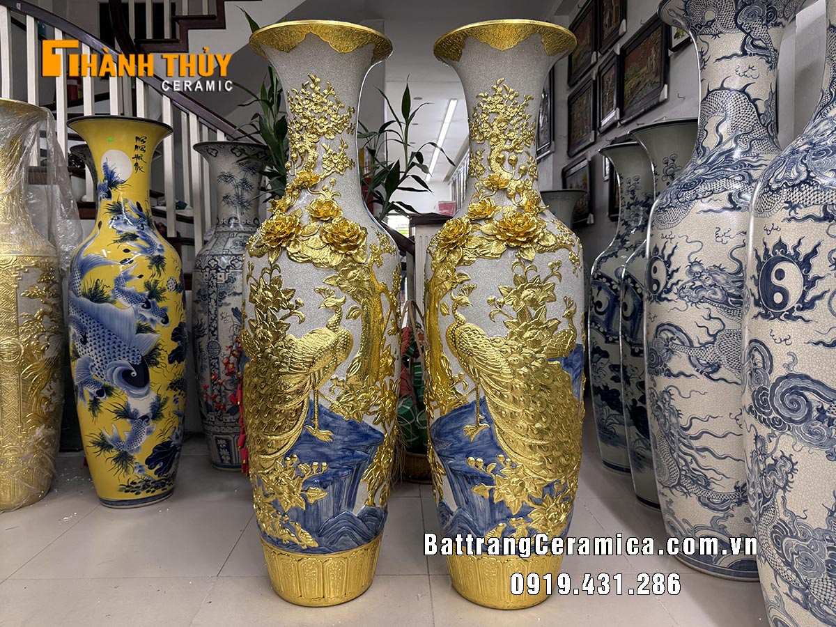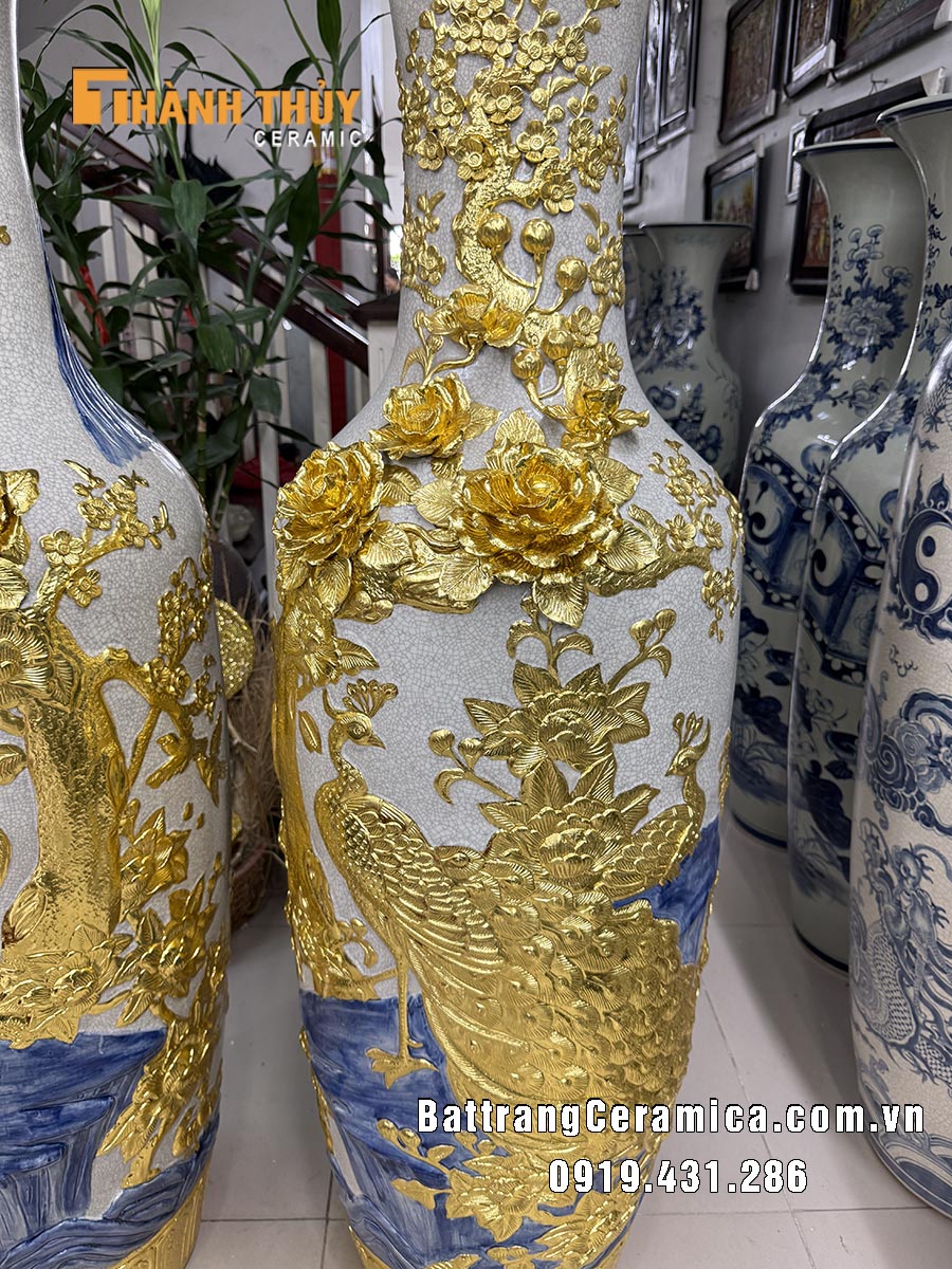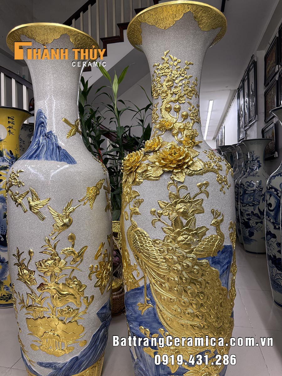 Lộc bình dát vàng cao cấp Công Đào 1m4 là dòng lộc bình đắp nổi của Bát Tràng. Đôi lọ lục bình sứ này được đắp nổi thủ công vô cùng tinh sảo, bố cục đẹp nhấn nháy như 1 tác phẩm điêu khắc hoàn chỉnh. Đặc biệt những chi tiết chính trên thân bình được dát vàng, tạo thêm sự sang trọng đẳng cấp cho gia chủ.