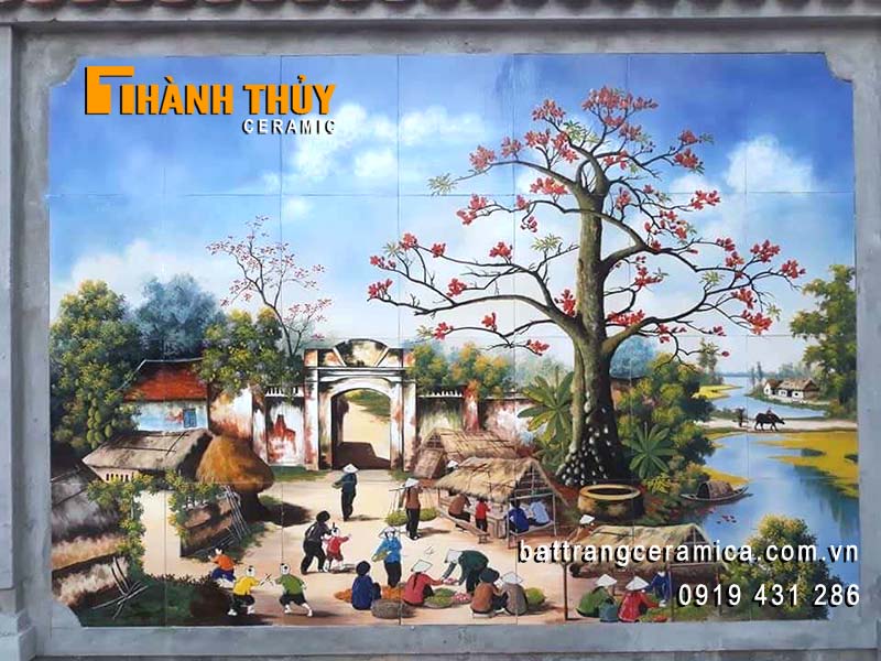 Tranh gốm sứ ốp tường ngoài trời vẽ phong cảnh chợ quê đẹp